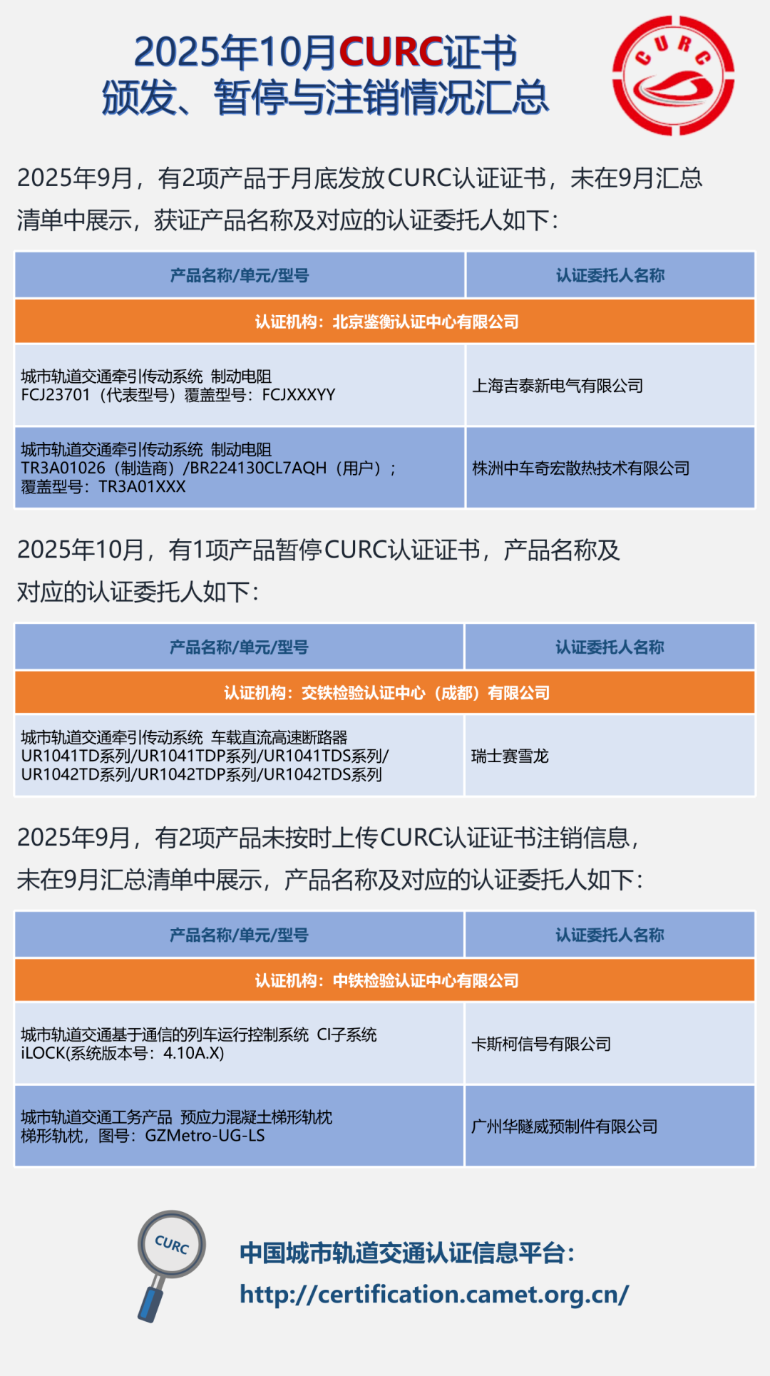2025年10月CURC证书颁发、暂停与注销情况汇总