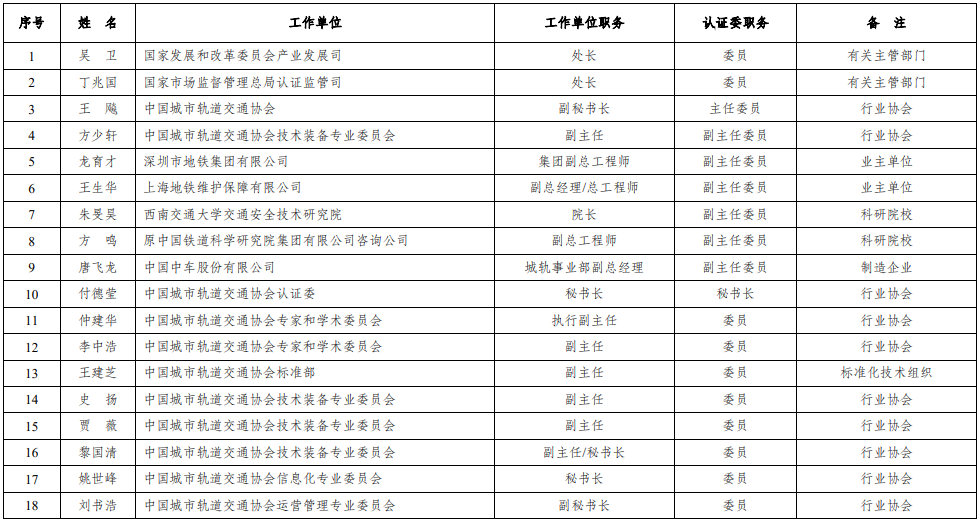 因部分委员工作职务发生变动,结合认证工作实际需要,协会对城市轨道交通装备认证技术委员会委员名单进行了调整,经国家有关部门同意,现予公布。