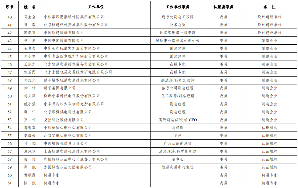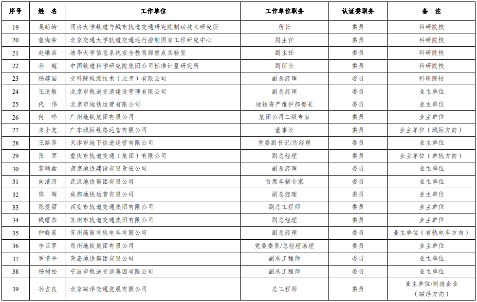 城市轨道交通装备认证技术委员会委员名单(2021)